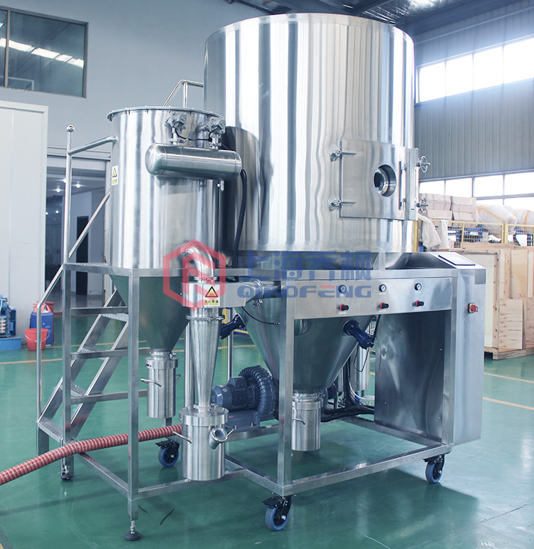 6.為了防止材料受到污染并延長設備的使用壽命,與材料接觸的所有部件均由不銹鋼制成。 噴涂后,液體霧化成分散的顆粒,表面積大大增加。 在與熱空氣接觸后,干燥過程可以在很短的時間內完成。
